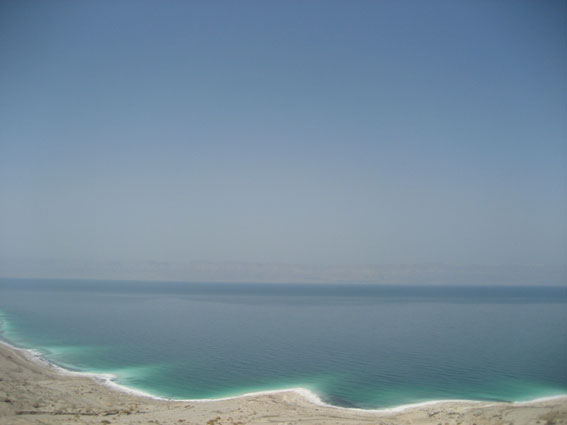 | Voilà enfin la fameuse Mer Morte, et son liseré blanc de sel.