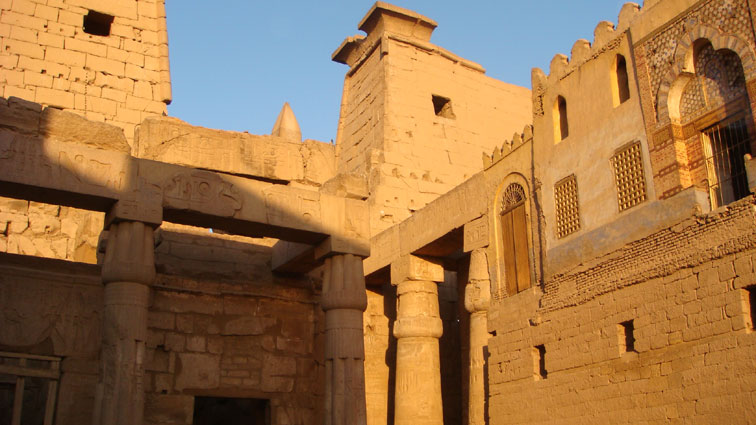 A l'intérieur du temple, on trouve une mosquée (en haut à droite). Elle a été construite sur les ruines du temple ensablé jusqu'à hauteur de la porte. Depuis, on a déblayé les fondations... |